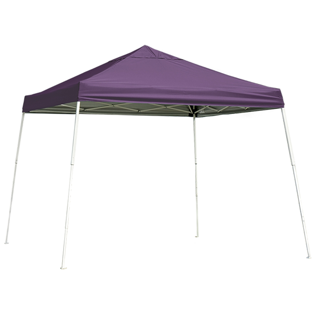 The ShelterLogic 10 x 10 ft. slant leg Pop-Up features an open top combined with sturdy construction and stylish design. Ideal for commercial use or for sports, backyard, tailgating, or camping. 10 x 10 ft. Pop-Up Canopy in purple.